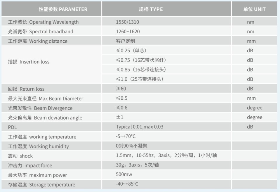 低插入損耗:單纖型(≤0.2dB),雙纖型(≤0.35dB) 高回波損耗:>55dB(最高可達70dB) 性能穩(wěn)定可靠,符合GR-1209-CORE和GR-1221-CORE標準產(chǎn)品結構緊湊,尺寸可根據(jù)需求定制產(chǎn)品使用材料符合最新RoHS要求。